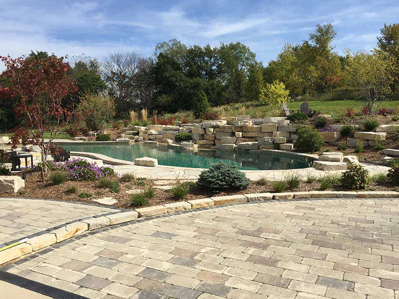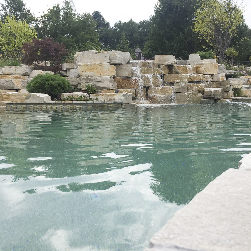 Silver Creek Stone Outcroppings installed around a pool with a waterfall by Meadow Green Group